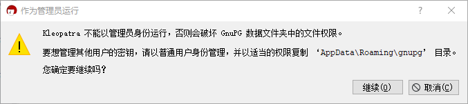打开 Kleopatra 时,打开程序遇到了提示:“Kleopatra 不能以管理员身份运行,否则会破坏 GnuPG 数据文件夹中的文件权限。要想管理其他用户的密钥,请以普通用户身份管理,并以适当的权限复制 ‘AppData\Roaming\gnupg’ 目录。”。