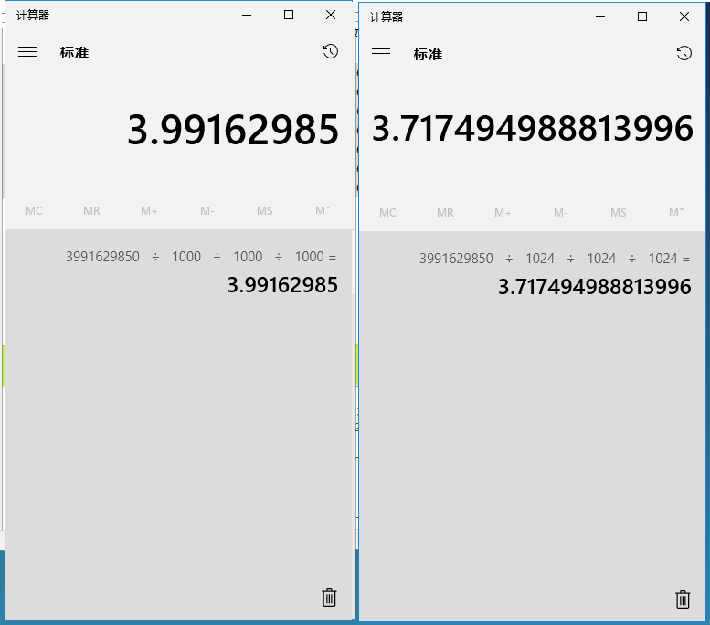 为了证实这个,我在Windows上将目录的字节大小记录下来(3,991,629,850 字节),用计算器分别计算了1024进制和1000进制分别得到的结果,如下图: