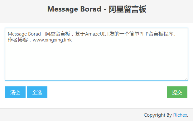 基于AmazeUI的一个简单PHP在线留言板程序 发表于 2016-07-10 更新于 2025-02-12尝试了一下AmazeUI,所以把这个留言板用AmazeUI做了一遍界面,非常简单的界面,部署到服务器上即可使用,留言提交后在txt目录下会有相应的txt文件,里面为反馈内容,可在里面查阅留言内容,或者使用一些在线文件管理程序查看也是不错的。下载地址下载地址