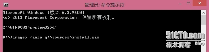 4、查看映像版本信息(可选步骤),在命令行中,切换位置到D盘根目录,这是imagex.exe工具存储的位置,输入: Imagex /info g:\sources\install.wim