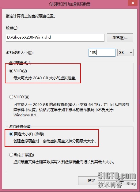 5、在弹出的操作窗口中,为VHD文件分配路径及文件名,输入VHD文件大小,VHD文件大小,视自己Windows 7系统盘的大小而定,这里我用,注意:图中圈出的两个选项,一定要选择VHD格式以及固定大小(如果仅仅用于测试,不考虑性能,可以选择动态扩展)。