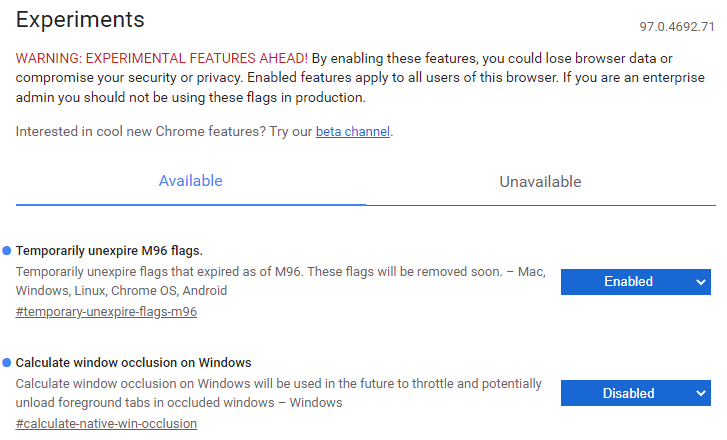 --disable-backgrounding-occluded-windows把 Temporarily unexpire M96 flags 改成 Enabled 然后 Calculate window occlusion on Windows 就會出來了(注意在我 Chrome 99.0.4844.74 版本已经没有 M96 的选项,所以该方法在较新版本的 Chrome 已经失效,请留意你的浏览器版本),如下图: